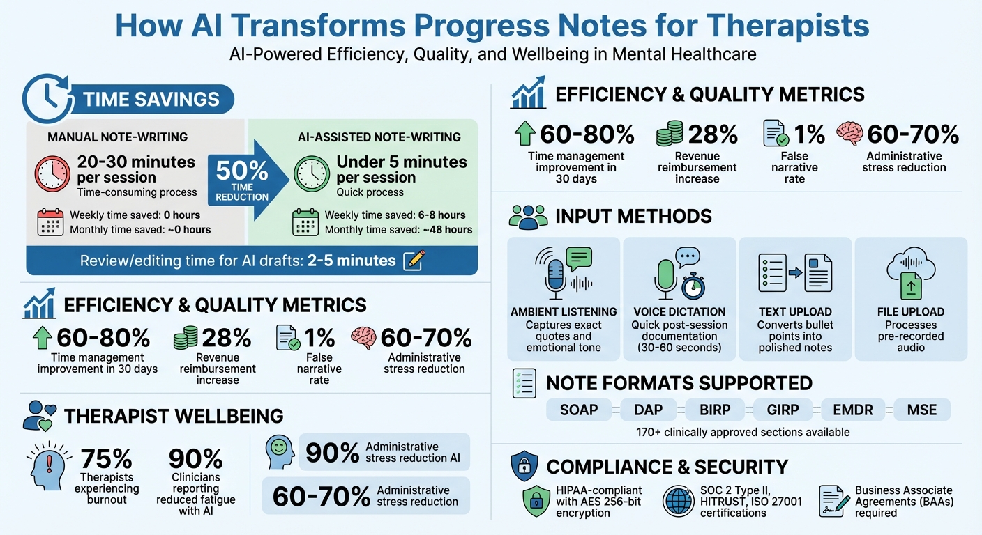 Writing notes manually can take 20–30 minutes per session, adding up to 10 hours weekly. AI reduces this process to under 5 minutes by generating structured notes like SOAP, DAP, or BIRP formats.