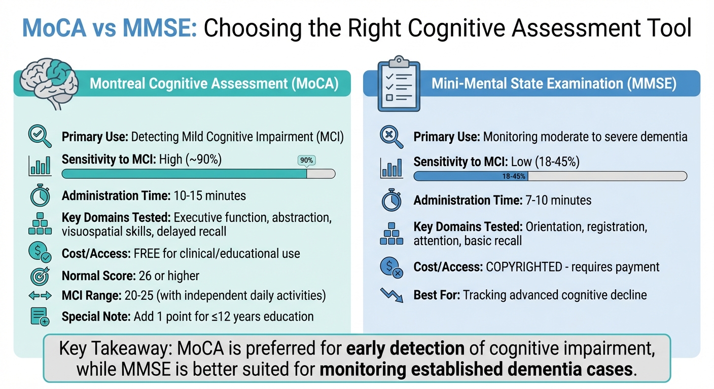 On the other hand, the MMSE focuses on simpler tasks like orientation, registration, attention, and basic recall. It’s quicker to administer - taking about 7 to 10 minutes - but it identifies only 18% to 45% of MCI cases.