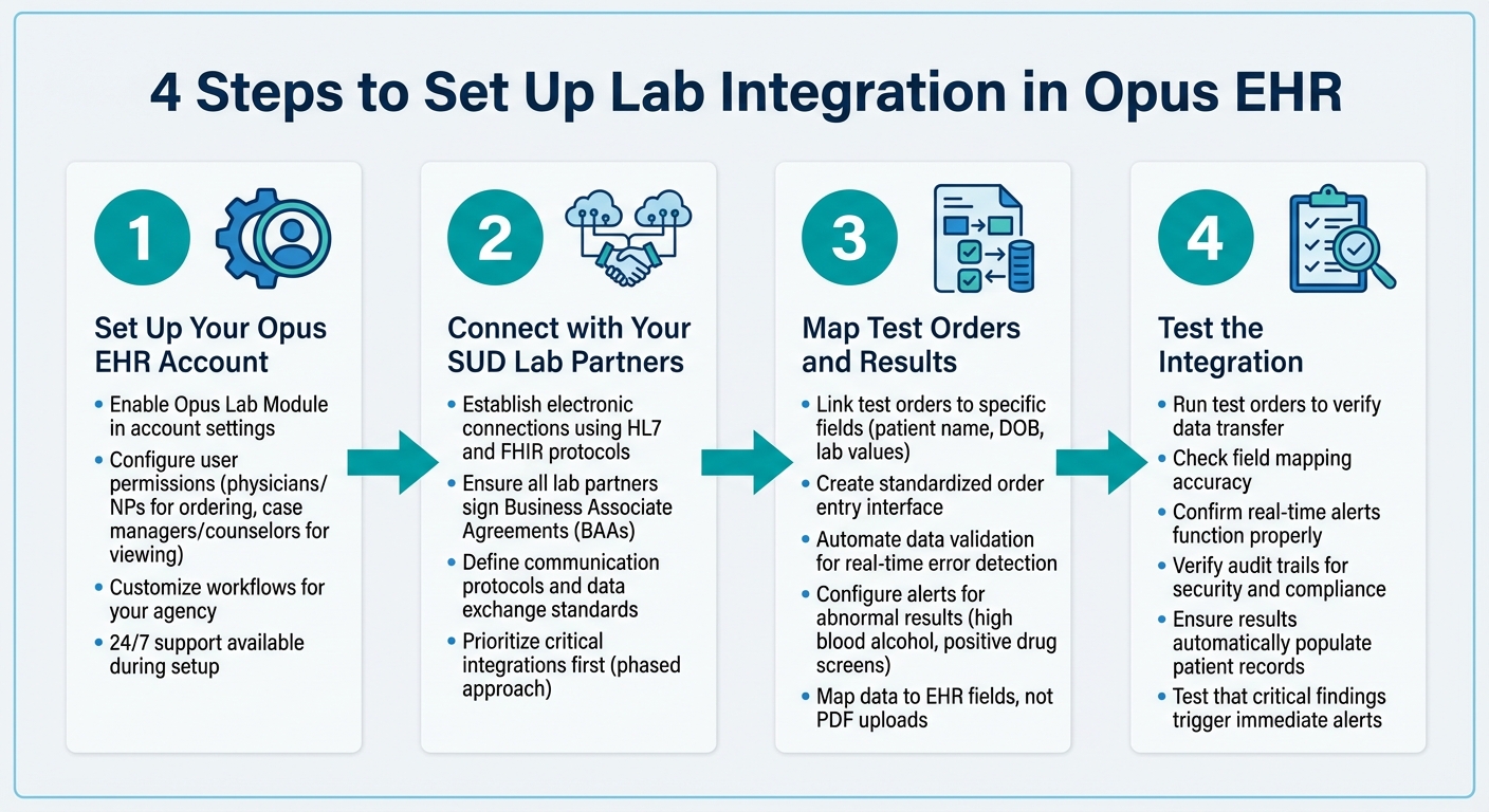 The process starts with a thorough system review, ensuring compliance with HIPAA and 42 CFR Part 2, and setting clear goals for success. After that, establish connections with lab partners, map test orders to specific EHR fields, and rigorously test the system before launching.