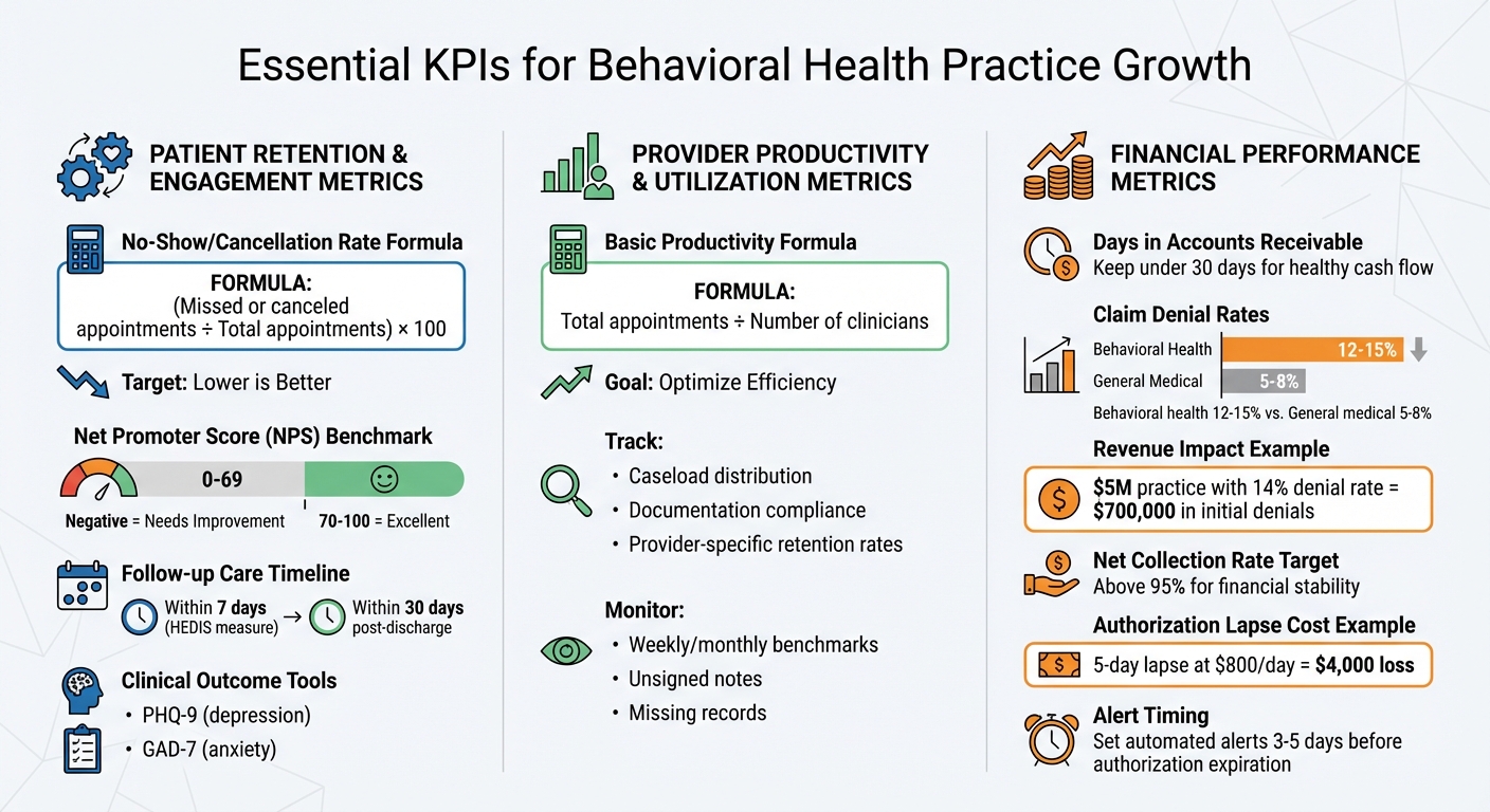 Keeping this metric under 30 days is essential for maintaining healthy cash flow [12]. Behavioral health practices often see claim denial rates of 12% to 15%, which is significantly higher than the 5% to 8% seen in general medical practices [11].